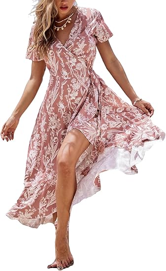 Women Summer Maxi Dress V Neck Short Sleeve Floral Print Wrap Slit Beach Casual Dress
