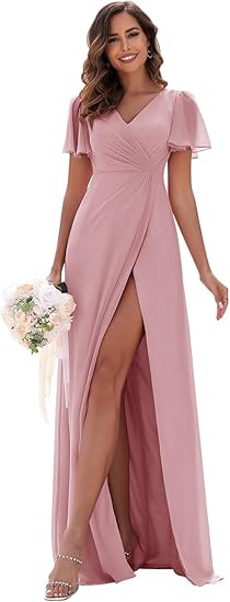 Bridesmaid Dresses Short Sleeve Long Chiffon Wedding Guest Dress Slit Formal Party Dress