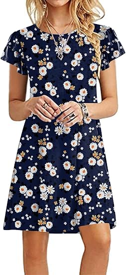 Women 2023 Mini Dresses Summer Casual Ruffle Short Sleeve Cute Crew Neck Flowy Dress with Pockets