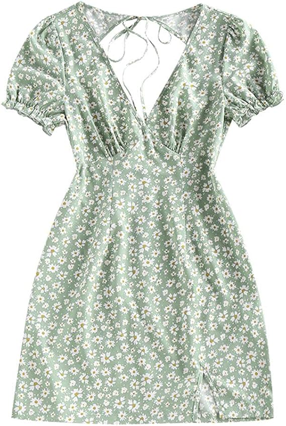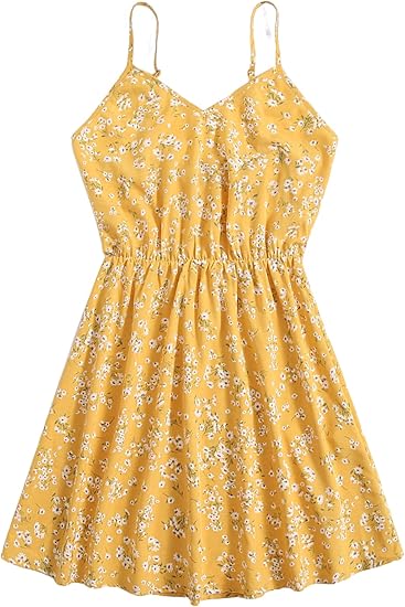 Women's Sleeveless V Neck Daisy Floral Short A Line Swing Cami Dress