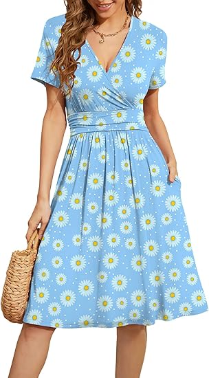Women's Summer Short Sleeve Casual Dresses V-Neck Floral Party Dress with Pockets