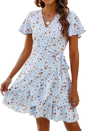 Women's Summer Wrap V Neck Polka Dot Print Ruffle Short Sleeve Mini Floral Dress with Belt
