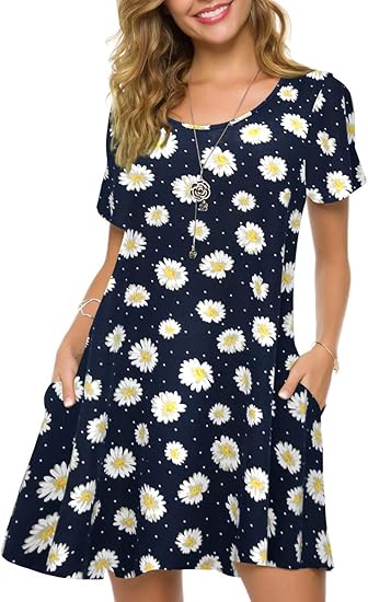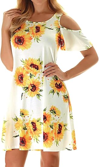 Womens Summer Cold Shoulder Floral Flowy T-Shirt Dress with Pockets