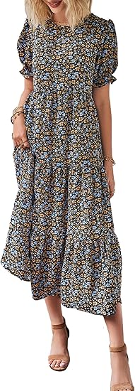 Women's Summer Casual Boho Dress Floral Print Ruffle Puff Short Sleeve Flowy Midi Beach Party Dresses
