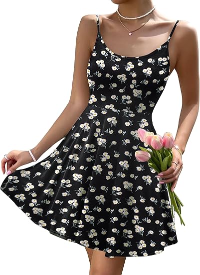 Women's Summer Dress Adjustable Spaghetti Strap Floral Mini Casual Dress with Pockets Fit & Flare Beach Sundress