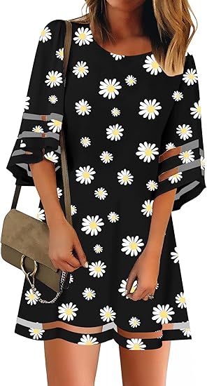 Women Casual Crewneck Mesh Panel 3/4 Bell Sleeve Loose Tunic Dress